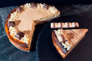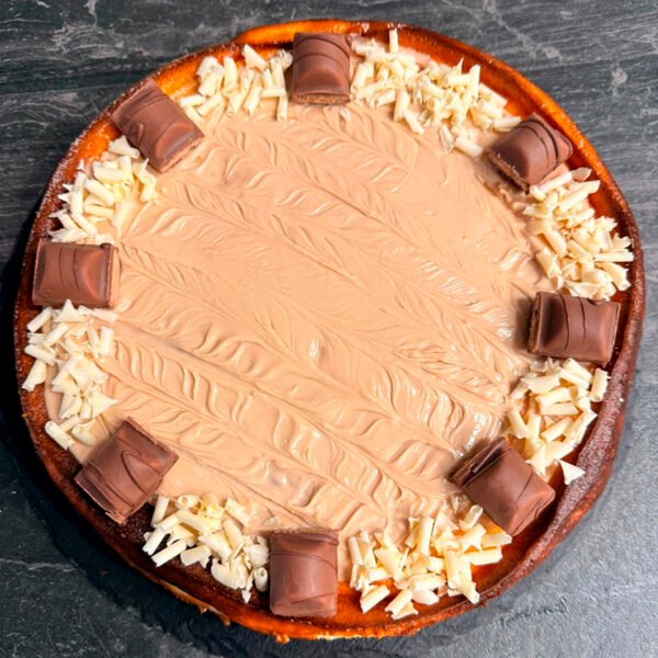 La Tarta de Queso y Kinder Bueno es puro capricho hecho postre. Cremosa, delicada y con ese inconfundible sabor a avellanas y chocolate blanco que recuerda a la mítica chocolatina. Una creación pensada para los más golosos, perfecta para sorprender y disfrutar de principio a fin.