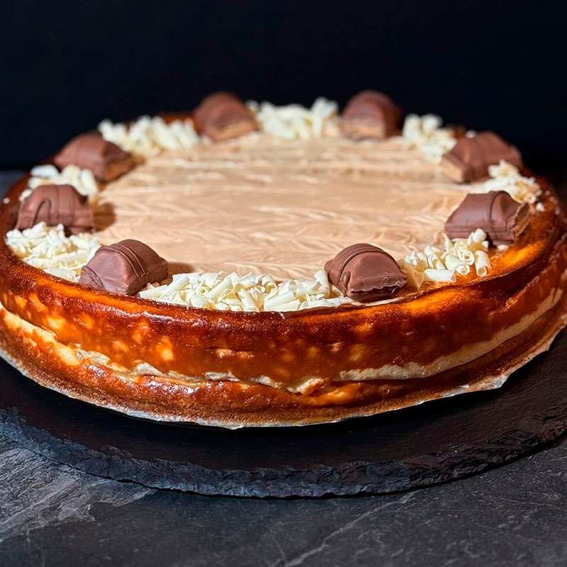 Su elaboración es totalmente artesanal, cuidando cada paso. Desde la base de galleta hasta la mezcla equilibrada de quesos, nata y crema de avellanas, todo se prepara con mimo para obtener un relleno cremoso y delicado. El resultado: una tarta espectacular, con el inconfundible sabor Kinder Bueno que enamora a pequeños y mayores.